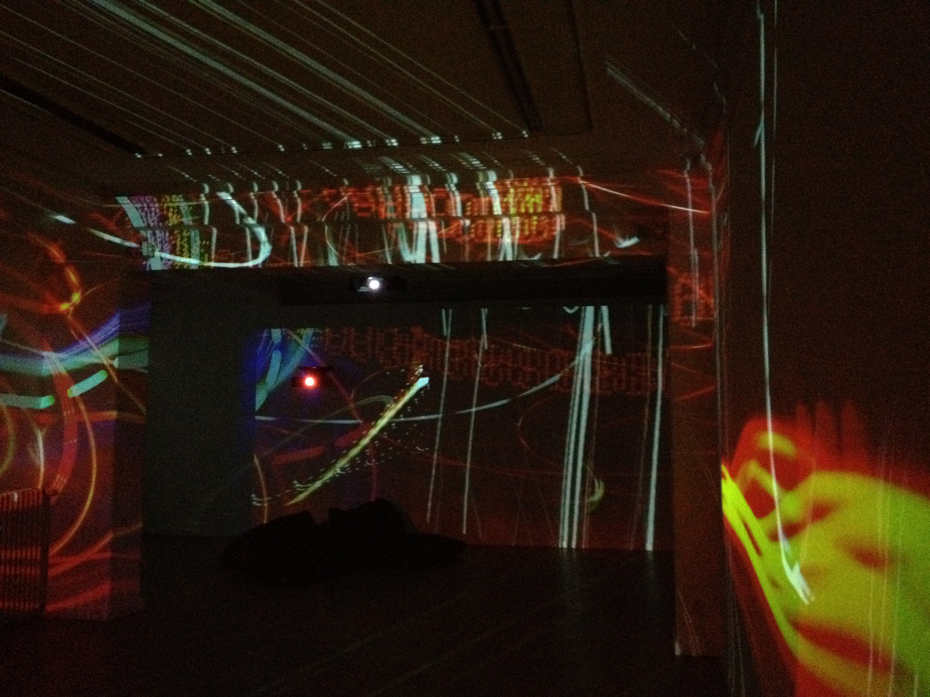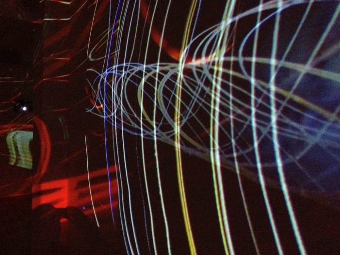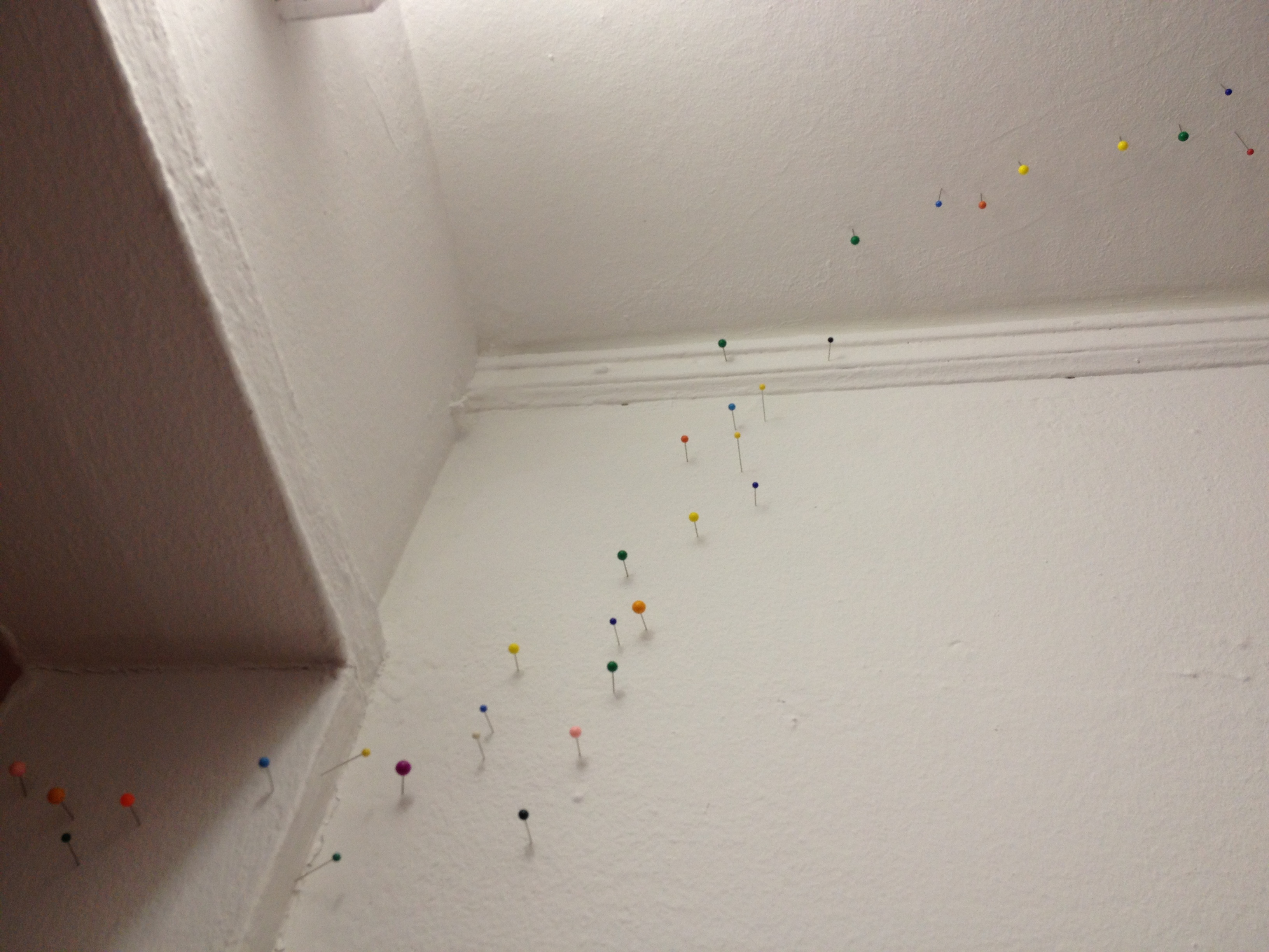 Kann man mit Licht malen? Vielleicht sogar in die Luft? Ja. Wer das nicht glaubt, der sollte die Ausstellung von Takehito Koganezawa im Berliner Haus am Waldsee besuchen. Das ist ein überaus vielseitiger Künstler, der seit etwa 20 Jahren in der deutschen Hauptstadt lebt. Im Erdgeschoss zeigt er ein psychedelisch wirkendes Werk: Aufnahmen von Lichtreklame aus Tokio, mit der Handkamera erstellt, werden von Beamern an die Wände projeziert. Besucher können sich im Halbdunkel auf Sitzsäcke fläzen und die Zuckungen des Lichts verfolgen. Aus dem Nebenraum verfolgen einen dann die Geräusche von singenden Gläsern (Kennt jeder: Mit einem nassen Finger auf dem Rand eines Glases kreisen). Koganezawa spielt das auf mehreren Monitoren ab. Besonders hübsch ist ein weiteres Kunstwerk: eine Ameisenstraße, die aus Stecknadeln besteht und sich quer durch das Gebäude zieht (siehe Foto ganz unten). Die Ausstellung läuft bis 20. Mai 2012.