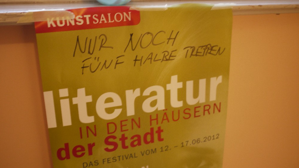 Zunächst mal ist es ein wenig gewöhnungsbedürftig. Man meldet sich via Internet für eine Lesung an, überweist seine 18 Euro Eintrittsgebühr und erhält eine Adresse, von mir aus: Elberfelder Straße 197a, III. Stock links, bei Pfannschmidt klingeln. Dann steht man da. Und soll bei Pfannschmidts klingeln. Obwohl man sie überhaupt nicht kennt. Auf ihrem Wohnzimmersofa sitzen, ihren Wein trinken und einem Schriftsteller zuhören.