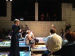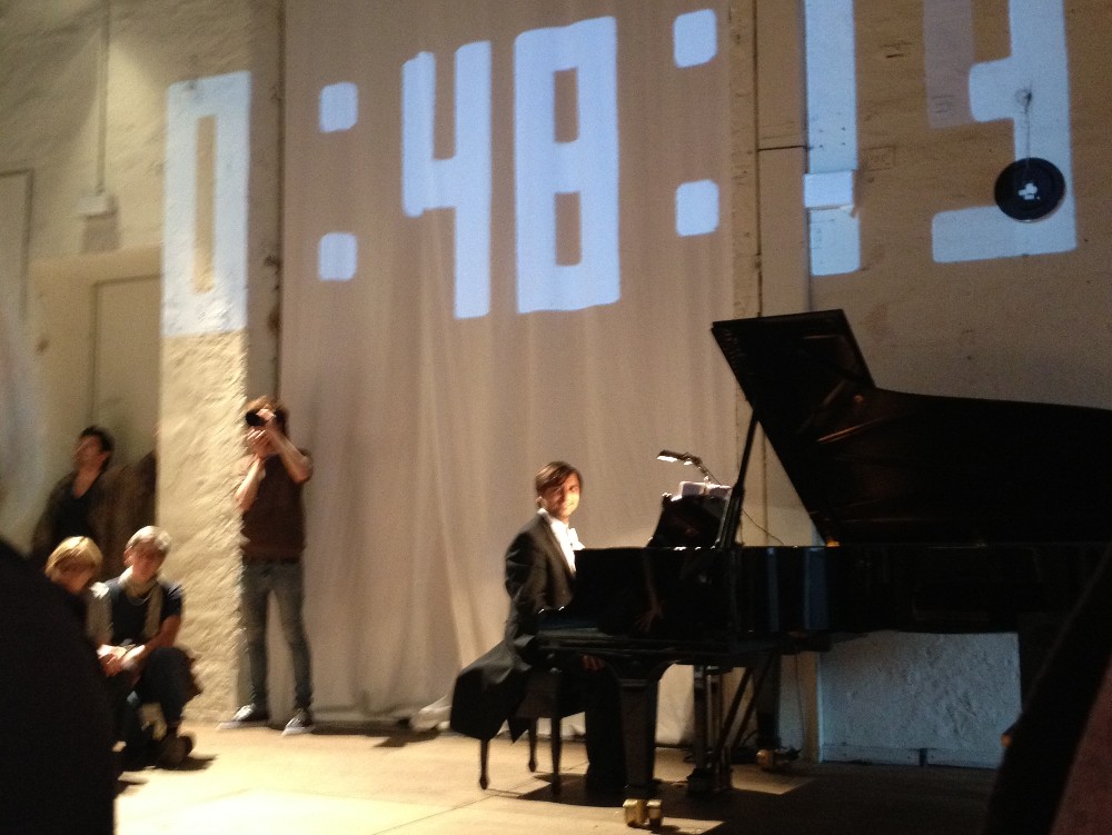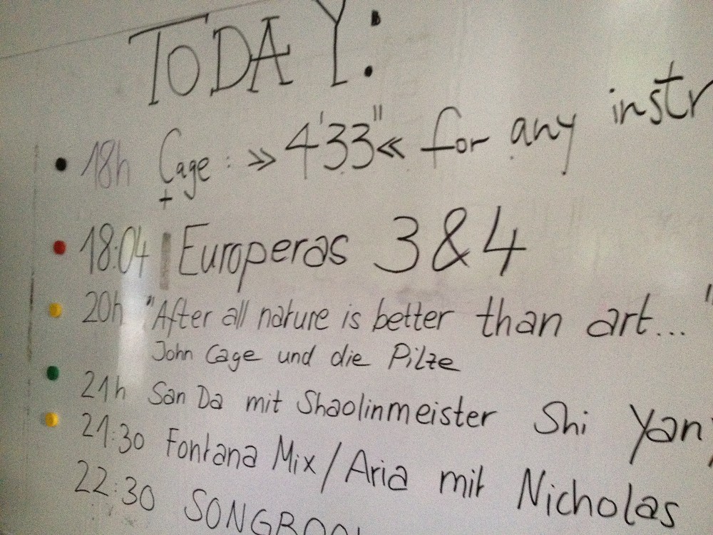 Die Berliner Staatsoper hat eine gute Lösung gefunden und ihre Werkstatt für zehn Tage (bis 15. Juli 2012) zum Cagespielhaus umfunktioniert. Eine Fluxus-Wandelhalle, in welcher der Künstler schon mal mit dem Fahrrad zur Bühne fährt und in der die Besucher zwecks wechselnder akustischer Erlebnisse während des Konzerts herumspazieren. Mein Cage-Abend begann mit dem wohl berühmtesten Stück des Meisters – 4´:33´´. Da stehen professionelle Musiker/Sänger exakt vier Minuten und 33 Sekunden vor Publikum auf der Bühne und schweigen. Immer wieder ein sensationelles Erlebnis.
