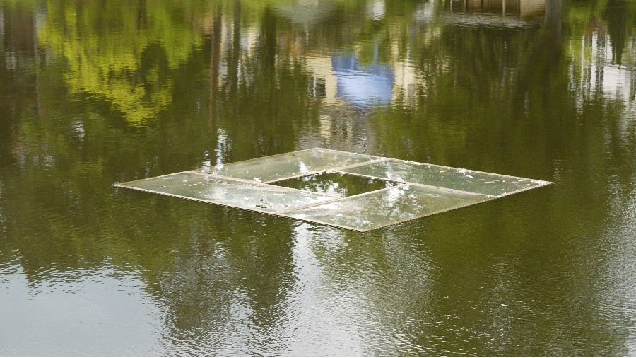 Den nahen Waldsee hat der Japaner Reijiro Wada für das wohl meditativste Werk der Ausstellung verwendet. Vier Fensterscheiben aus Isolierglas treiben auf dem Wasser. Die Fischer können durch sie in den Himmel blicken, die Menschen, wenn sie denn dem Kunstwerk nahe genug kommen, erhalten einen Einblick in das, was sie unterhalb des Wasserspiegels abspielt. Und selbst wenn man es nicht sehen kann, ist doch der Gedanke schön, dass man es sehen könnte, wenn man denn mit einem Ruderboot hinausfahren würde…