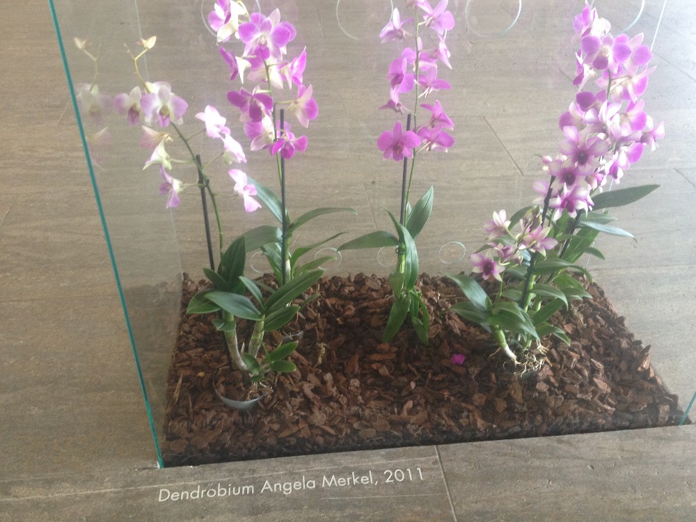 In unmittelbarer Nähe zum Kanzleramt, kaum 500 Meter entfernt, wächst und gedeiht Dendrobium Angela Merkel. Die Orchidee Angela Merkel. Der erfolgreiche Architekt und Universitätsdozent Arno Brandlhuber hat sie in der Eingangshalle des Hauses der Kulturen der Welt pflanzen lassen. Dort, wo normalerweise Fliesen den Boden wasserdicht versiegeln, sind jetzt kleine Gärten entstanden, mit einem Glassturz vor dem Zugriff der Passanten und dem widrigen Berliner Klima geschützt.