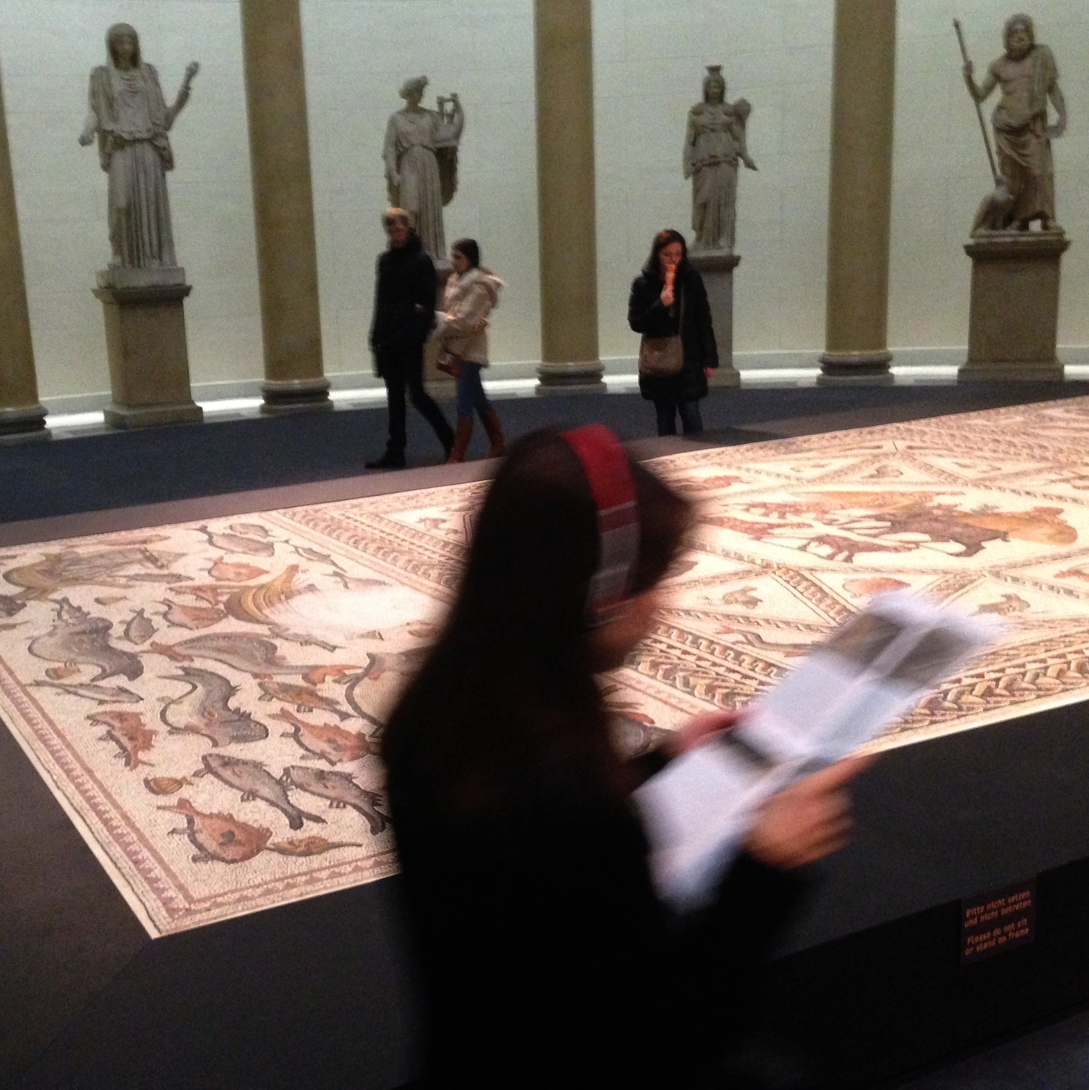 Es ist wohl eines der berühmtesten Fußbodenmosaike der Welt, das bis Mitte Mai 2014 im Alten Museum in Berlin ausgestellt wird. Es stammt aus dem Örtchen Lod südlich von Tel Aviv und wird auf das dritte Jahrhundert nach Christus datiert. Das Mosaik schmückte den Eingangsbereich der Villa eines reichen römischen Bürgers. Erst 1996 war es bei Straßenbauarbeiten zufällig gefunden worden.