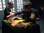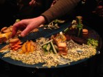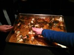 Beispiel eins: In einer großen Blechwanne sind Tofustückchen, Schellfisch und Koriander aufeinander geschichtet. Das ganze sieht aus wie eine Landschaft. Dann wird literweise heiße Misosuppe darüber gegossen. Eine Videokamera überträgt das auf eine Großleinwand im Saal. Und tatsächlich fühlt man sich als Zuschauer an eine Überschwemmung erinnert. (siehe unten bei den Fotos – nach der Flut)