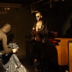 Die Zuschauer kommen ausnahmsweise vor Beginn der Aufführung selbst in die Maske. Sie erhalten, wenn sie denn einverstanden, eine schwarze Gesichtsmaske aufgemalt. Das ist insofern ganz lustig, als während der einstündigen Vorstellung Künstler und Besucher nicht immer sofort auseinander zu halten sind. Es sei denn, sie machen den Mund auf oder springen plötzlich auf den Tresen.