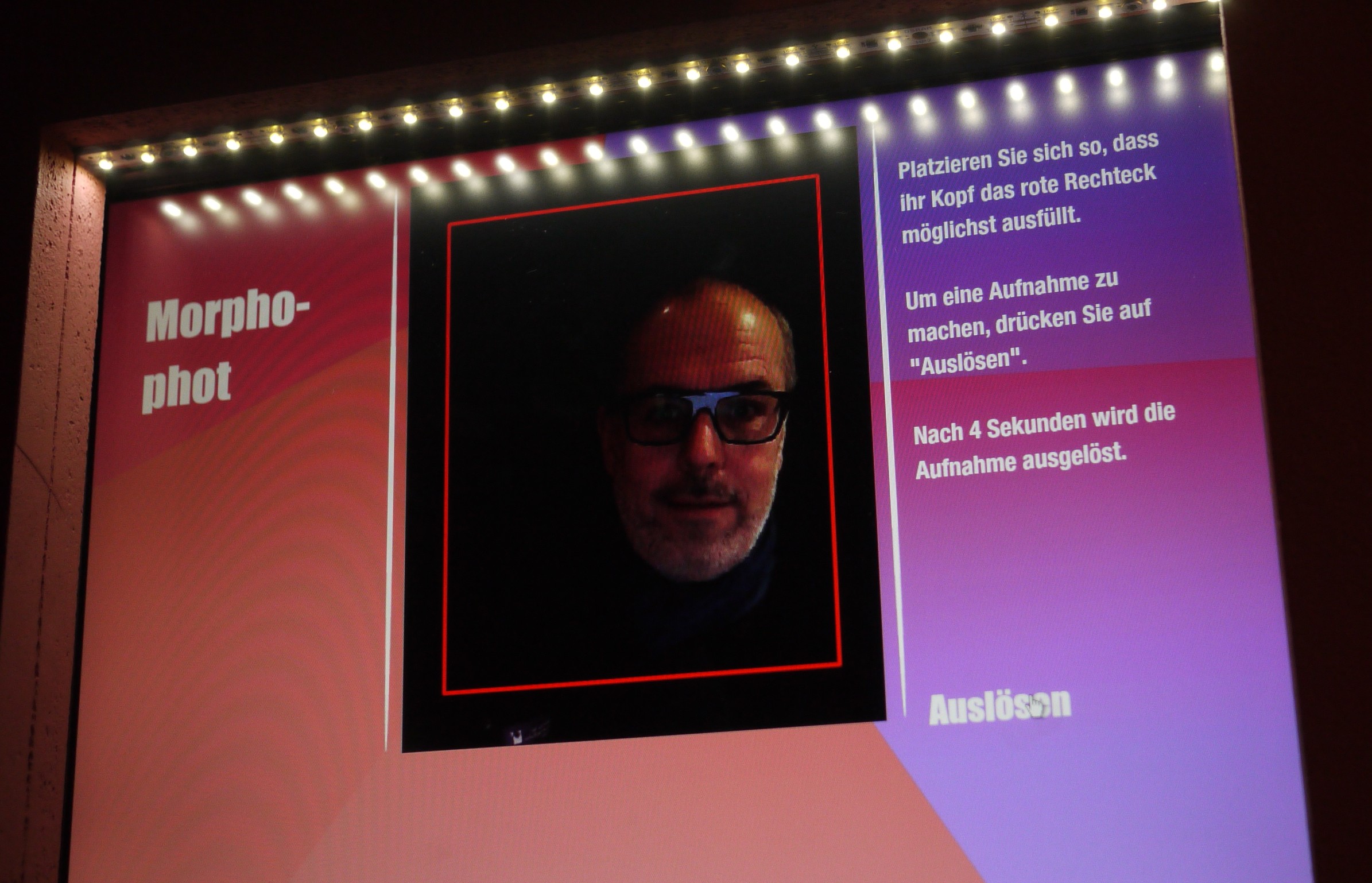 Ein anderes Experiment: Der Besucher setzt sich in einen Fotoautomaten, wie man ihn von Bahnhöfen kennt, und lässt sich dann fotografieren. Dann landet diese Aufnahme auf einem Bildschirm mit den Aufnahmen der letzten 15 Besucher. Und nun geht es los: Man kann sein Porträt mit dem eines anderen mixen und erhält dann ein völlig neues Antlitz. Ich habe das auch gemacht (siehe unten). Von links sind zu sehen: mein Originalporträt, ein Mix mit einer älteren Dame, mit einem jungen Mann und mit einem Kind.