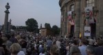 Die Plätze in der vordersten Reihe sind schon zwei Stunden vor Beginn der Veranstaltung belegt. Aber solch einen Stuhl in der ersten Reihe braucht man eigentlich gar nicht unbedingt. Es gibt genügend andere Orte. Da sind zum Beispiel die Treppenstufen am Eingang zum Bode-Museum und da ist das Geländer der Monbiju-Brücke. Beides etwas harte, aber ziemlich charmante Sitzgelegenheiten.
