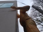 Der Clou an der Skulptur: Der Riese blickt nicht nur durch die Wand hindurch. Vom Inneren der Figur aus wird auch noch gefilmt, was außen von sich geht: staunende Passanten in erster Linie. Es kommen ja genügend Menschen vorbei: Besucher des Gorki-Theaters, Studenten der Humboldt-Uni und Touristen, die zur Museumsinsel wollen