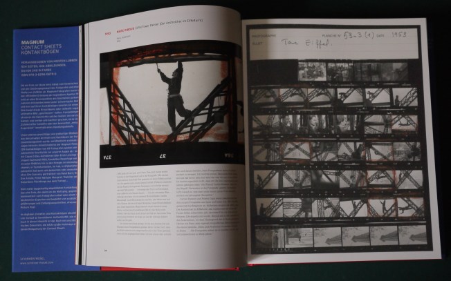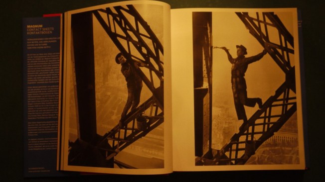 In der Ausstellung (und in einem dicken, fast 50 Euro teuren Katalog) ist zum Beispiel zu sehen: Thomas Hoepkers Aufnahmen aus New York nach den Anschlägen vom 11. September 2011, Peter Marlowes Porträts der britischen Premierministerin Margaret Thatcher (1981), David Hurns Probenfotos der Beatles (1964), René Burris Aufnahmen von Che Guevara (1963) und Martin Parrs Szenen aus einem verfallenen Badeort in der Nähe von Liverpool (1985). Untenstehende Katalogauszüge zeigen Marc Ribouds berühmt gewordene Fotos von einem Eiffelturmanstreicher aus dem Jahr 1953. Wer die Aufnahme rechts unten sieht und sie mit den anderen vergleicht, wird sich nicht mehr wundern, warum es ausgerechnet dieses tänzerisch leichte Motiv in die Geschichte der Fotografie geschafft hat.