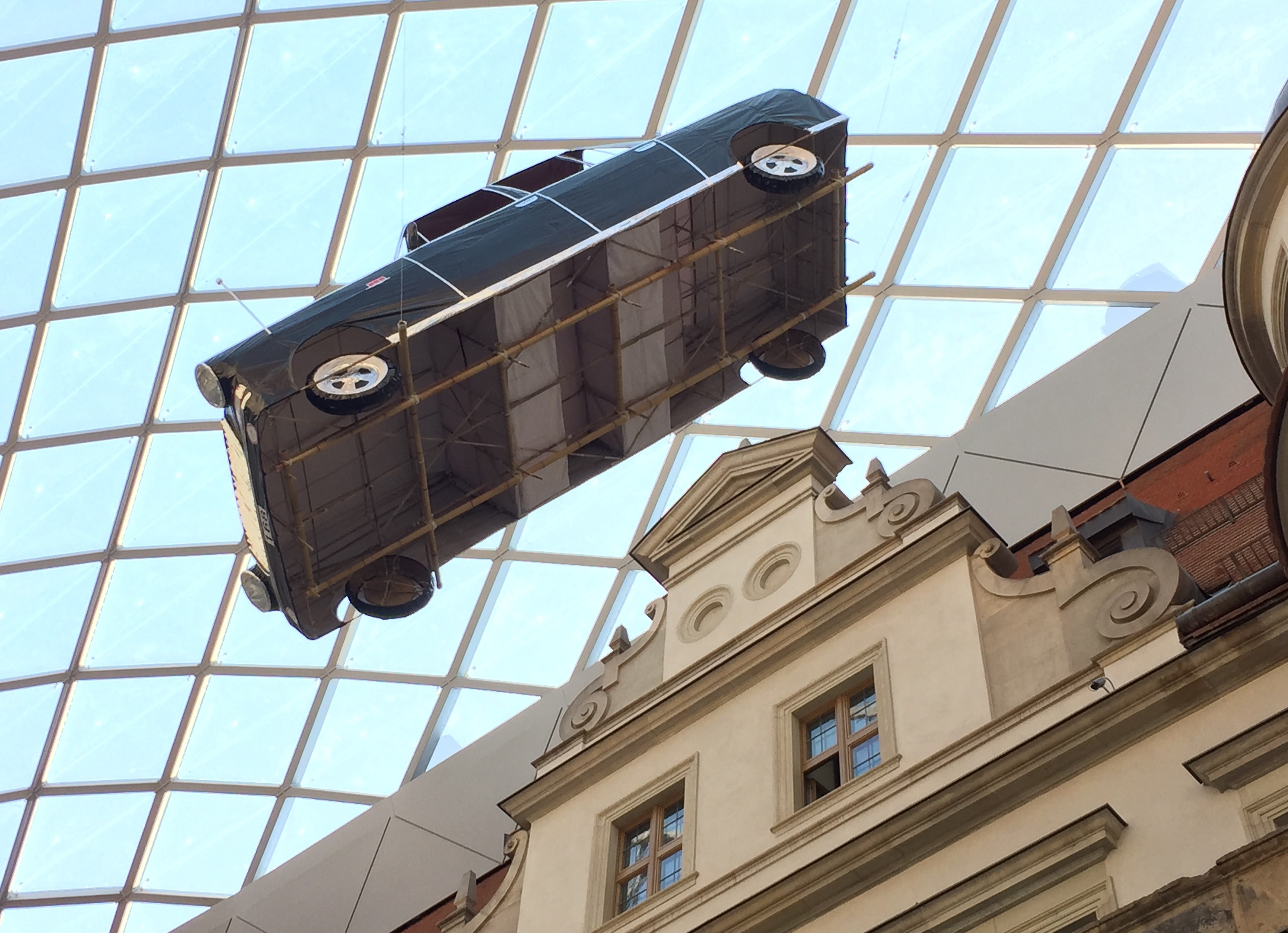 Es gibt sogar Autos aus Pappe in Originalgröße. Ein Modell davon wurde in Dresden für die Ausstellung „Supermarket of the Dead“ in luftiger Höhe im Innenhof des Residenzschlosses aufgehängt. Diese Installation erinnert ein wenig an das Auto im britischen Musical „Chitty Chitty Bang Bang“, wie es scheinbar in der Gegend herumfliegt.