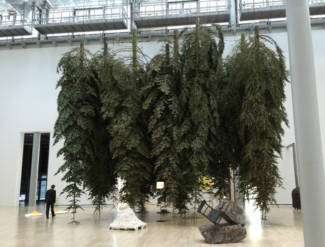 Der mit dem grünen Eimer über dem Kopf – das bin ich. Als vorübergehender Bestandteil einer Ausstellung. Ich stand 60 Sekunden so da. Versuchte, den mir von höherer Stelle erteilten Auftrag „Und an Fichte denken“ zu erfüllen. Während über mir verkehrt herum aufgehängte Nordmanntannen schwebten.
