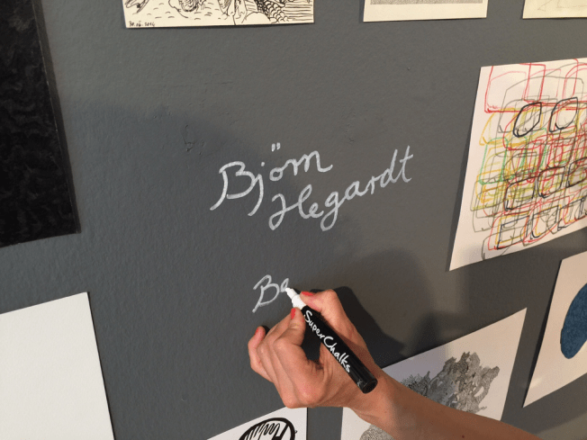 Ich habe mich relativ schnell für die Zeichnung eines Industrie- oder Vergnügungsparks entschieden, einen Schattenriss (Foto oben). Ein Werk, das ich mir gut bei mir zuhause an der Wand vorstellen kann – und zwar nicht nur ein paar Monate lang. Nach Übergabe der 200 Euro erfuhr ich dann: Es stammt von Björn Hegardt, einem norwegisch-schwedischen Künstler, der in Berlin lebt, die Zeitschrift FUKT herausgibt und einen hervorragenden Namen als Zeichner hat. Ich erhielt die Zeichnung und an die leere Fläche an der Wand wurde Björn Hegardts Name geschrieben. Ökonomisch gesehen habe ich eine gute Wahl getroffen. Aber zuvor hatte die Entscheidung alleine aus der Begeisterung für das Werk heraus gestanden. Das ist mir persönlich noch mehr wert.