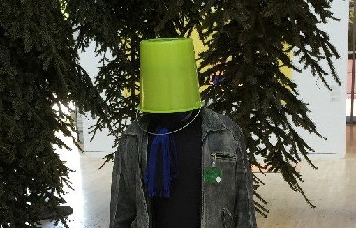 Der mit dem grünen Eimer über dem Kopf – das bin ich. Als vorübergehender Bestandteil einer Ausstellung. Ich stand 60 Sekunden so da. Versuchte, den mir von höherer Stelle erteilten Auftrag „Und an Fichte denken“ zu erfüllen. Während über mir verkehrt herum aufgehängte Nordmanntannen schwebten.