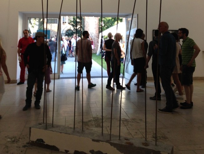 Der mit dem grünen Eimer über dem Kopf – das bin ich. Als vorübergehender Bestandteil einer Ausstellung. Ich stand 60 Sekunden so da. Versuchte, den mir von höherer Stelle erteilten Auftrag „Und an Fichte denken“ zu erfüllen. Während über mir verkehrt herum aufgehängte Nordmanntannen schwebten.