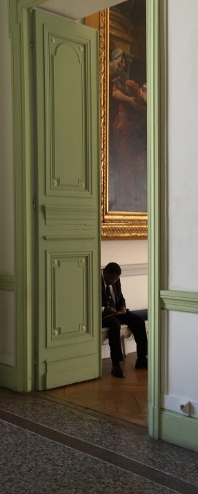 Der Gelangweilte: Er interessiert sich nicht mehr (oder hat sich noch nie interessiert) für das, was da um ihn herum an den Wänden hängt. Und im Grunde auch nicht für die Museumsbesucher. Für ihn ist der Job erkennbar eine Quälerei. In früheren Zeiten hat er Bücher oder Zeitschriften gelesen, wenn ihm das erlaubt war. Heute verbringt er, wenn er nicht gerade auf seine Schuhe starrt, die Zeit mit seinem Smartphone. Das rettet ihm seinen Tag.