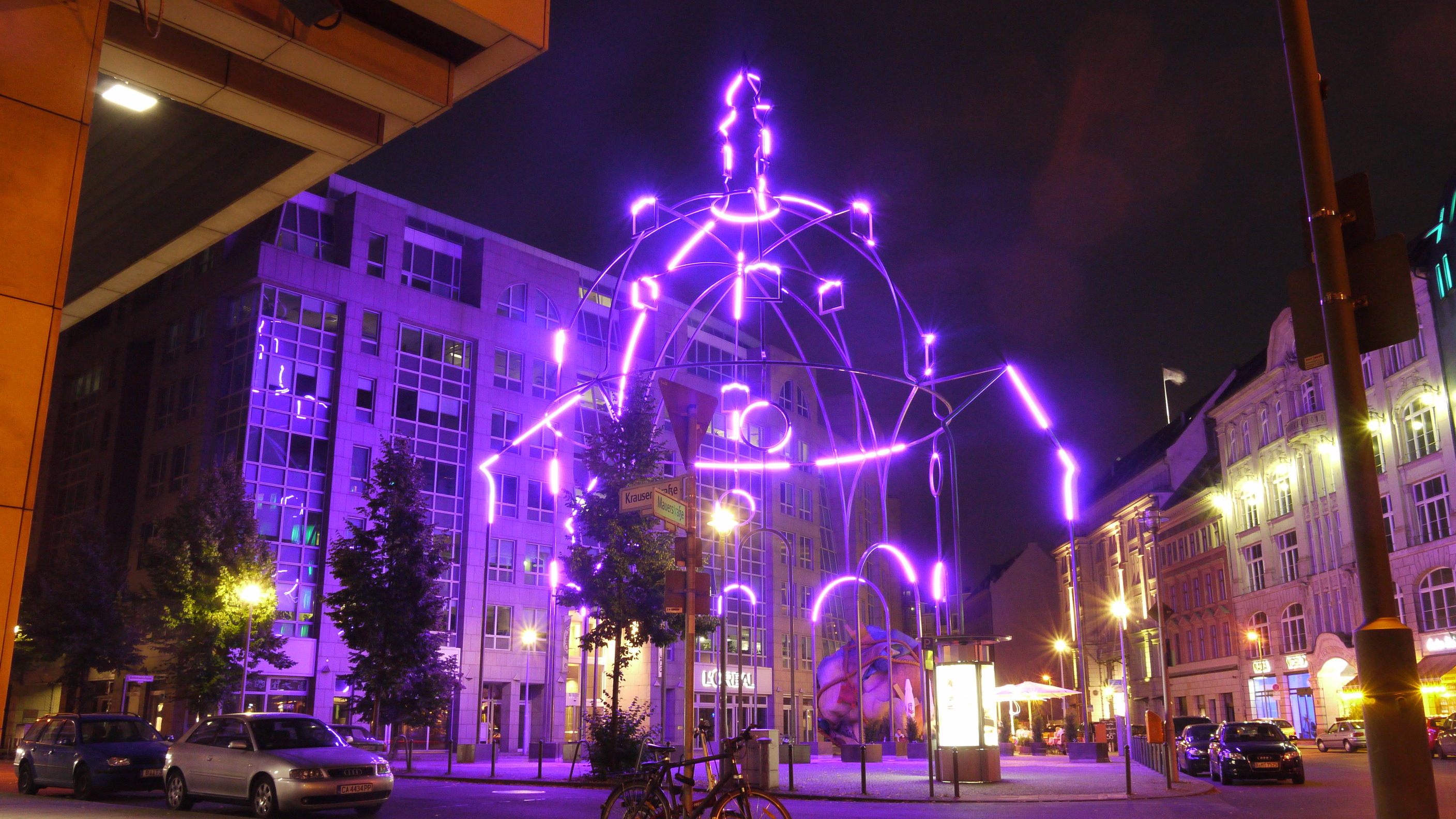Auf dem Bethlehemkirchplatz in Berlin-Mitte stand mal eine Kirche. Gut 200 Jahre lang war das so. Bei einem Luftangriff wurde sie 1943 zerstört und 1963 sprengte man die kümmerlichen Überreste. Es schien für immer vorbei zu sein mit diesem Gebäude. Aber jetzt gibt es die Betlehemskirche wieder. In einer ganz neuen, ungewohnten Gestalt überrascht sie den nächtlichen Spaziergänger.